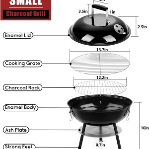 14 Inch Charcoal Grill, Small Black Enamel Outdoor BBQ Grill, Mini Flat Top Kettle Barbecue Grill with Screwdriver, Portable for Backyard Garden Camping Cooking Smoking, Dual Venting System
