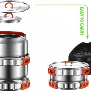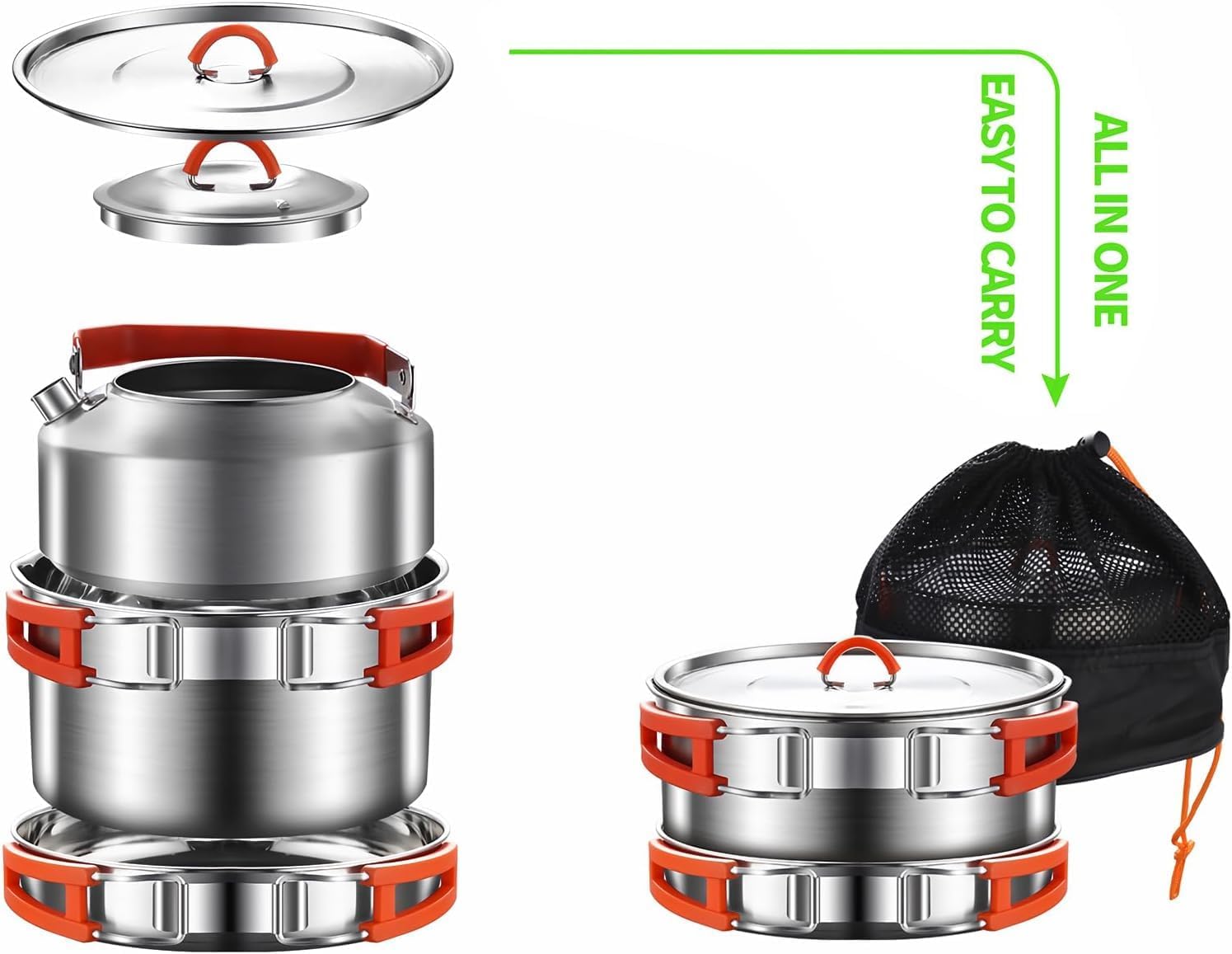 • Food grade stainless steel material: made of high-quality 304 stainless steel, this camping cookware set ensures durability and longevity. The durable material not only withstands the rigors of outdoors, but is also corrosion resistant, making it ideal for camping, hiking and other adventurous activities. You can count on this set to handle the wear and tear of normal outdoor cooking without compromising on performance or hygiene.